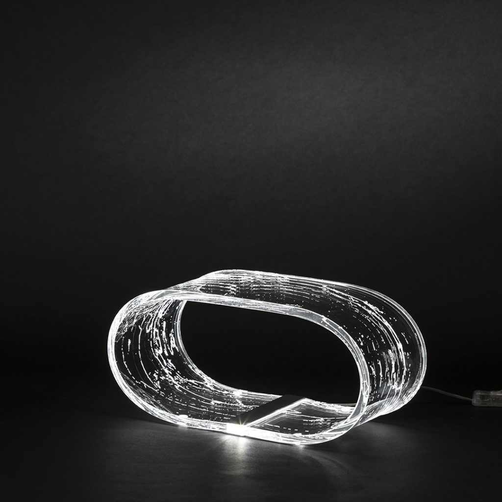 La lampe Future “Marbre” en cristal acrylique avec décor gravé au laser dispose d’une bande LED à la base qui illumine le corps de la lampe et ses gravures, créant un effet de diffusion spectaculaire.