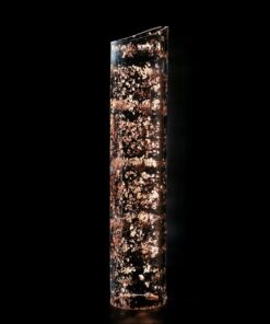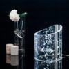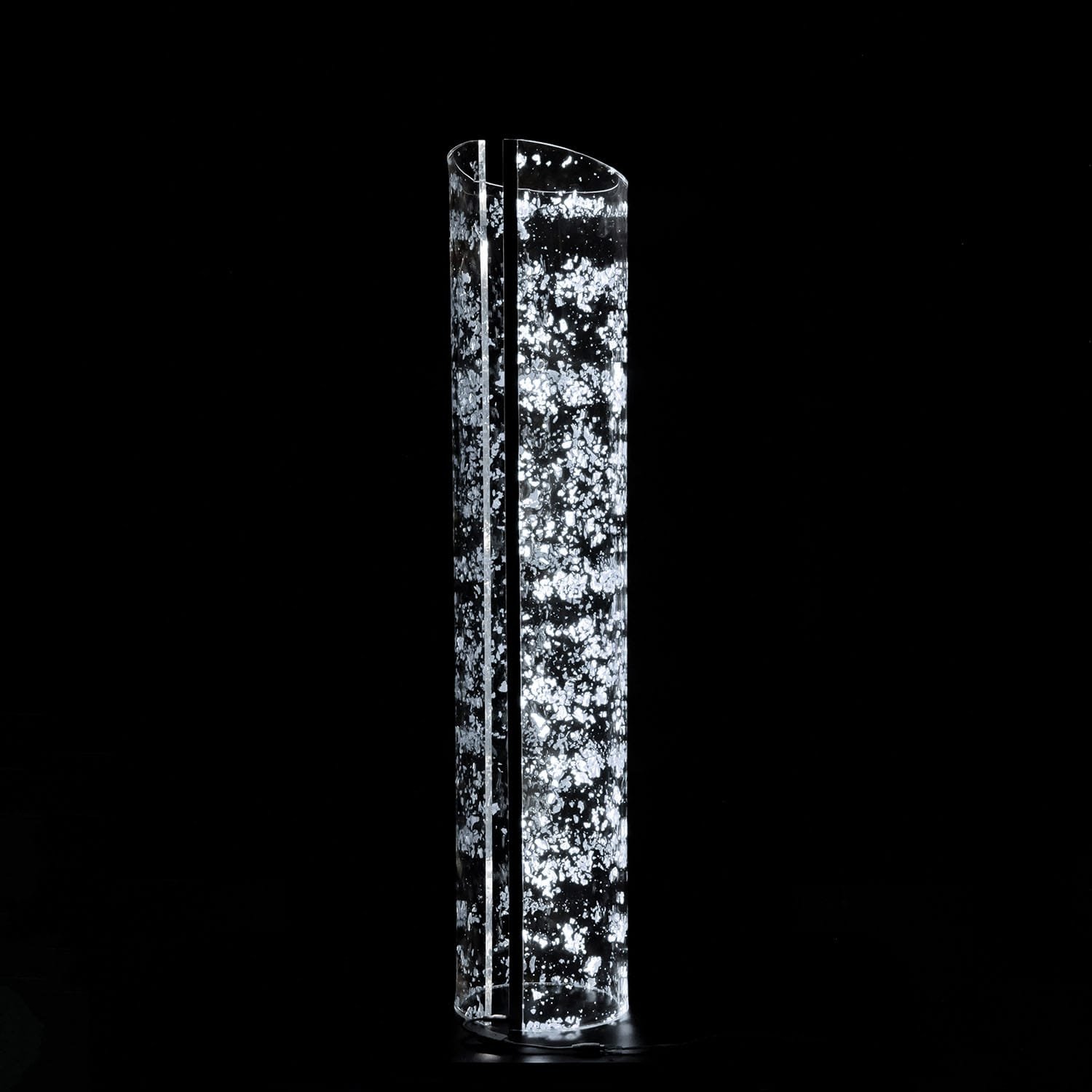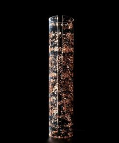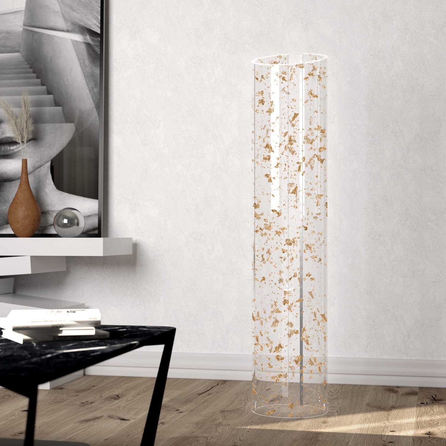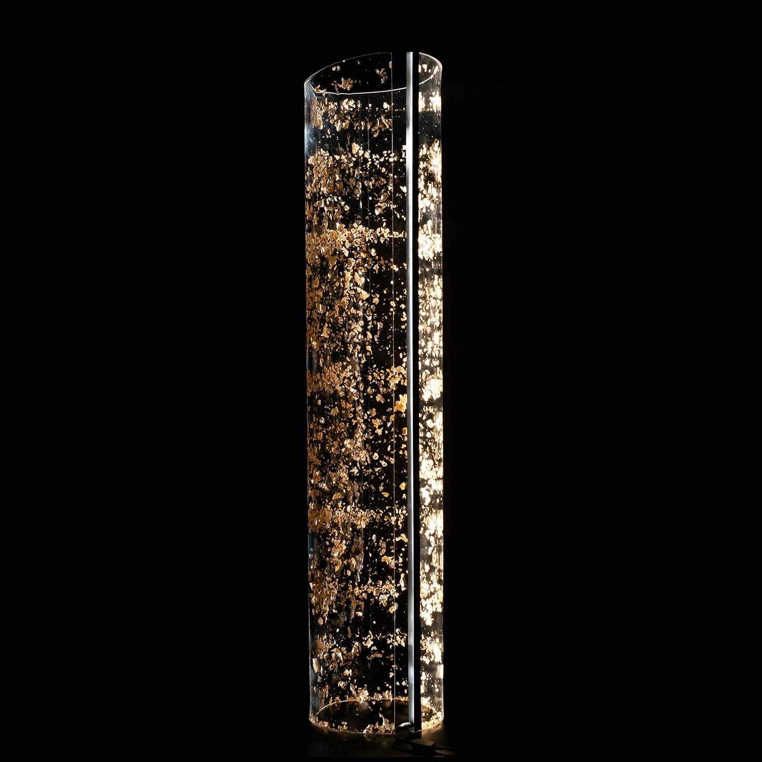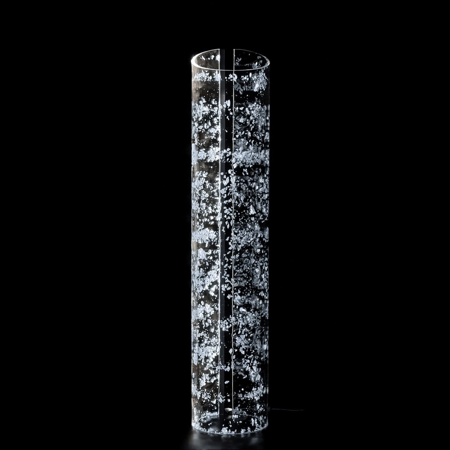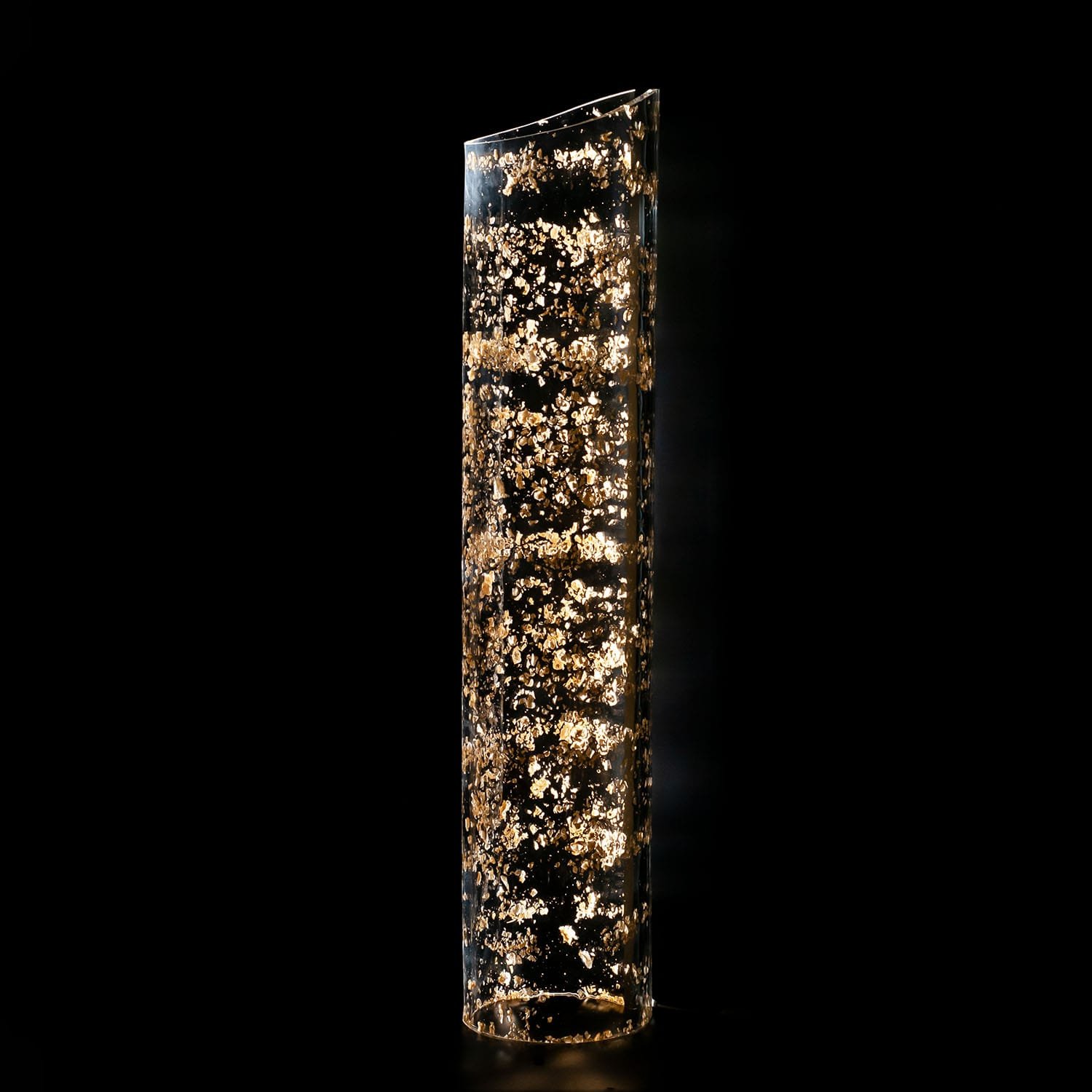 Wave est un lampadaire design, fabriqué à partir d’une seule feuille de cristal acrylique courbée à la main, avec des feuilles incrustées de matériaux précieux.