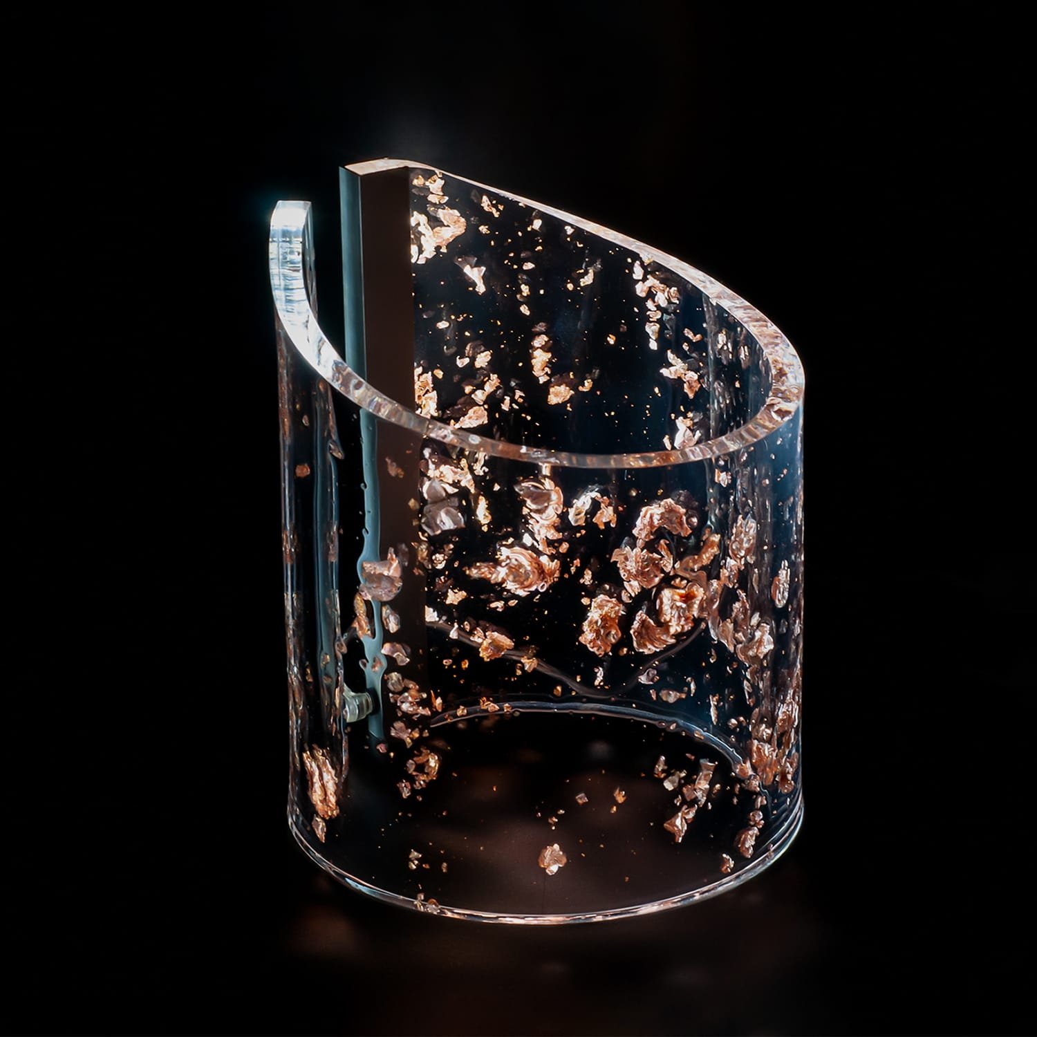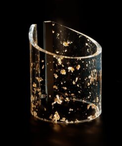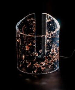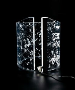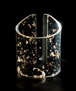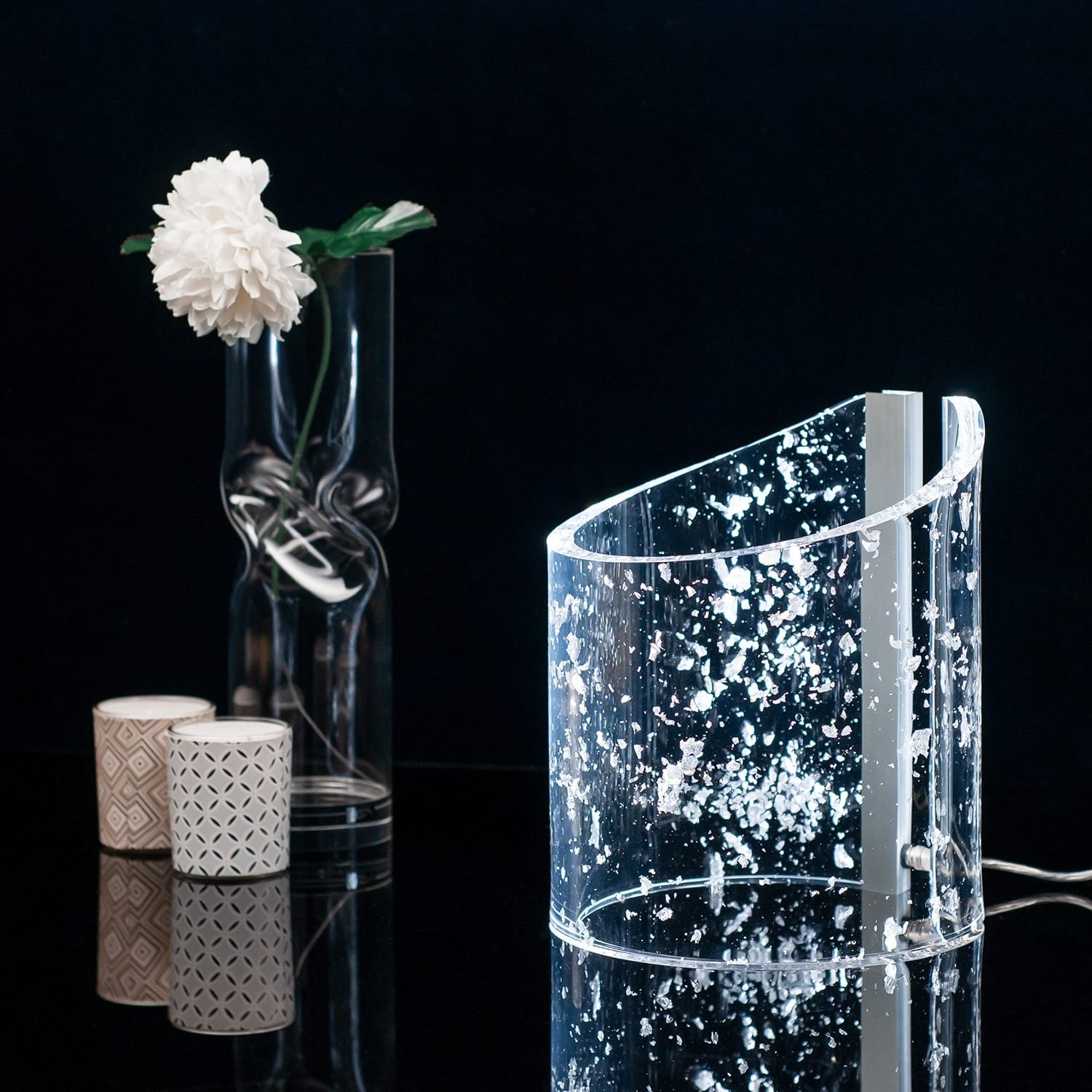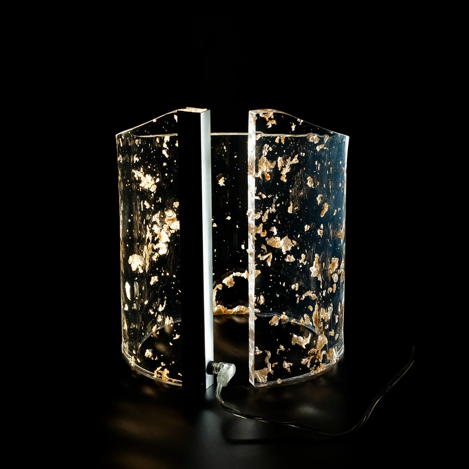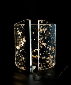 Wave est une lampe de table design, fabriquée à partir d’une seule feuille de cristal acrylique pliée à la main, avec des feuilles incrustées de matériaux précieux.