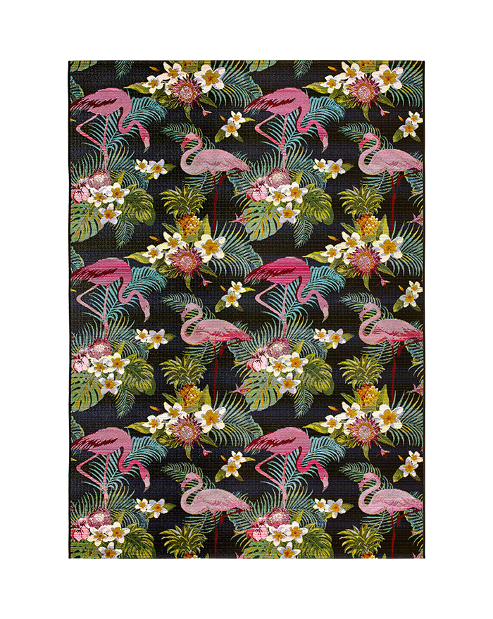 Ce tapis d’extérieur Amazonia présente un motif de flamants roses sur fond noir. Son tissage très solide est parfait pour les espaces extérieurs. Facile d’entretien, il résiste à l’eau