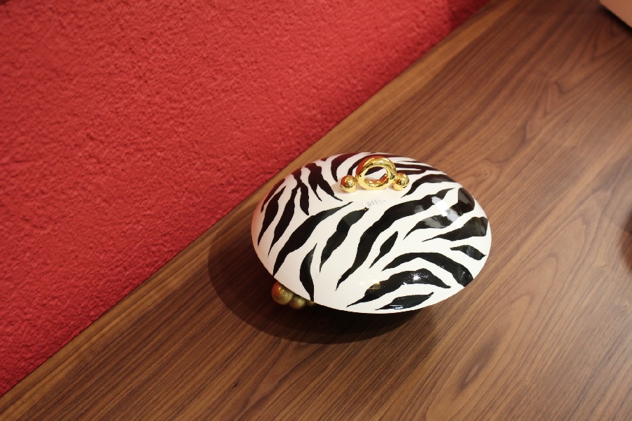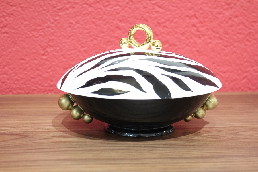 Bonbonnière de forme sphérique aplatie en faïence décorée de zébrure avec un couvercle surmonté d’un anneau émaillé en or véritable.