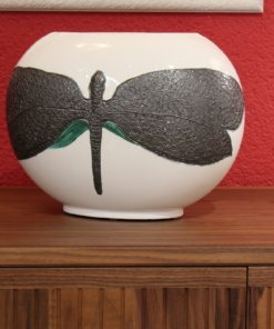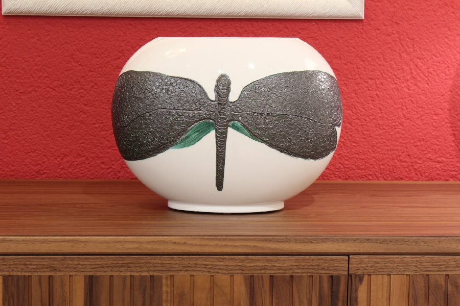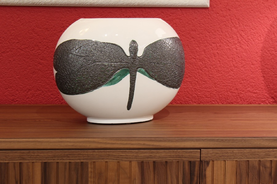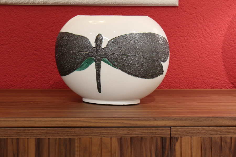 Magnifique vase d’inspiration Art Nouveau décoré d’une libellule en relief , fruit de la créativité de l’atelier Dal Prà en Vénétie.