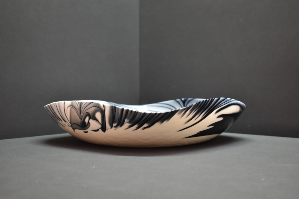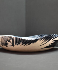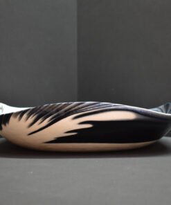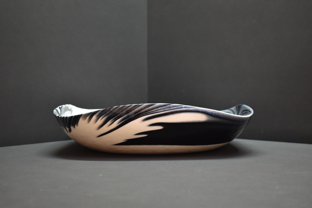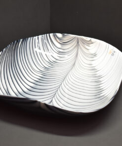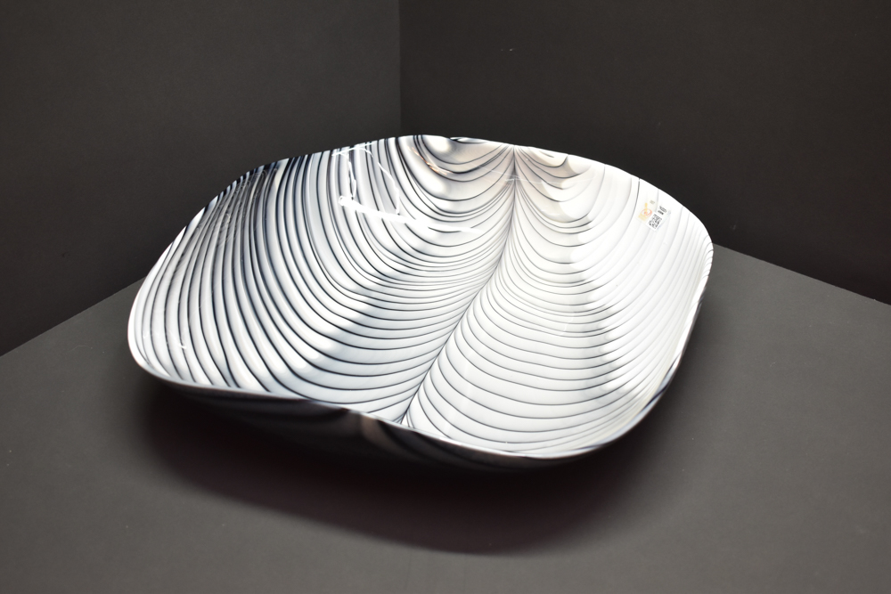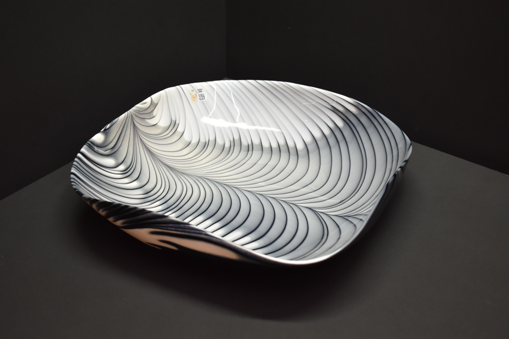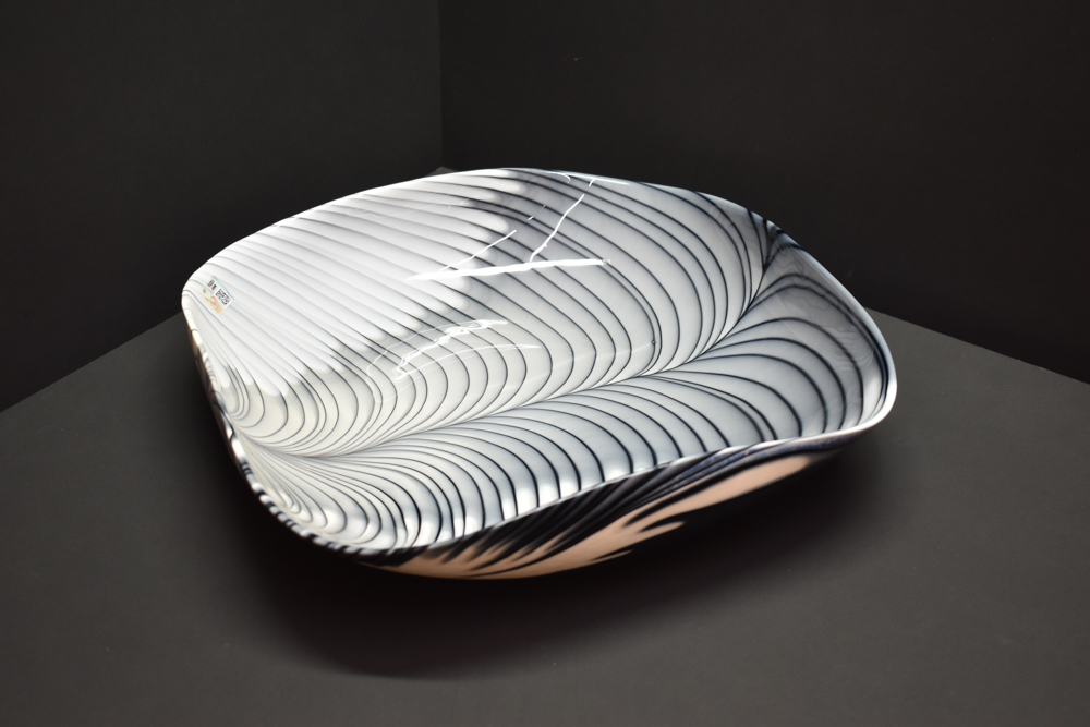 Coupe carré cintré effet plume de paon en verre de Murano produit dans la verrerie Yalos Ferro sur l’île de Murano à Venise.