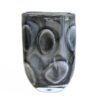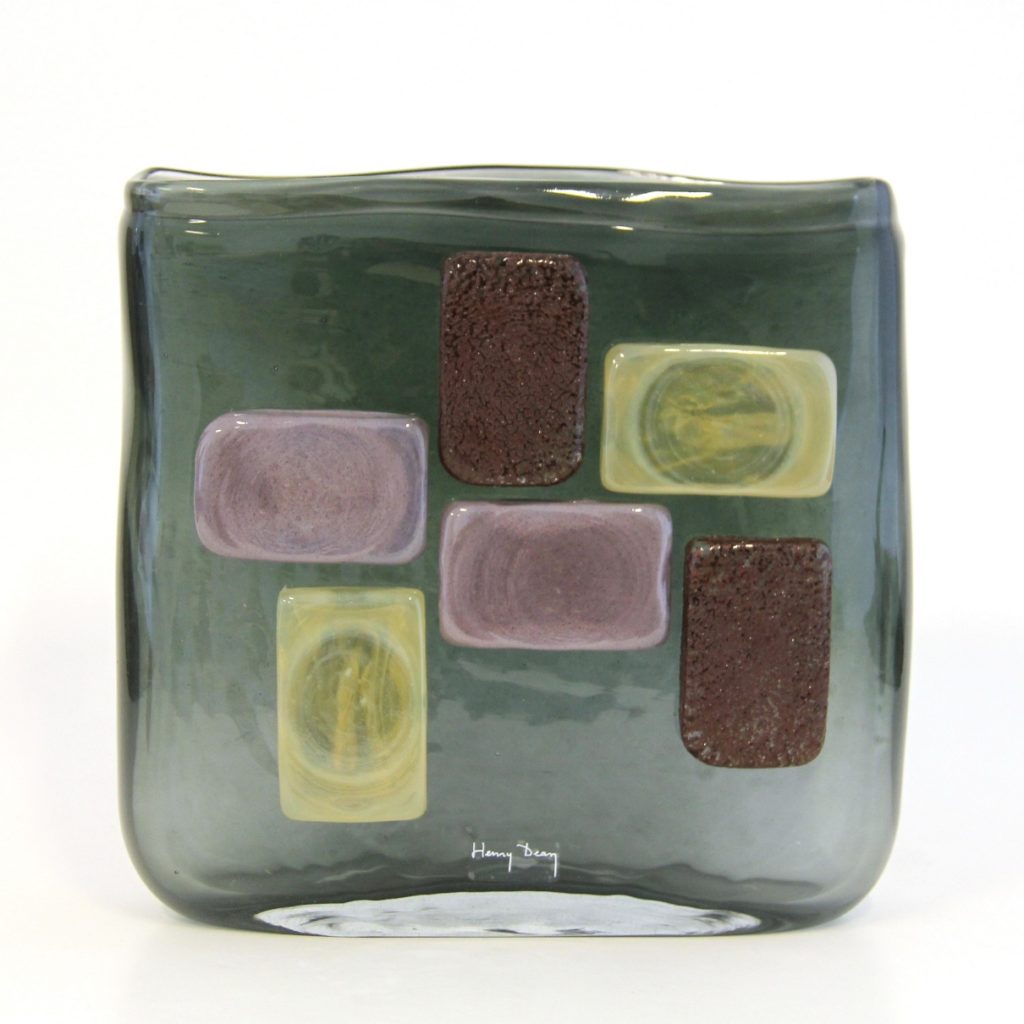 Vase rectangulaire de la collection et du verrier Henry Dean, en verre translucide orné d’un décor aux formes géométriques.
