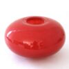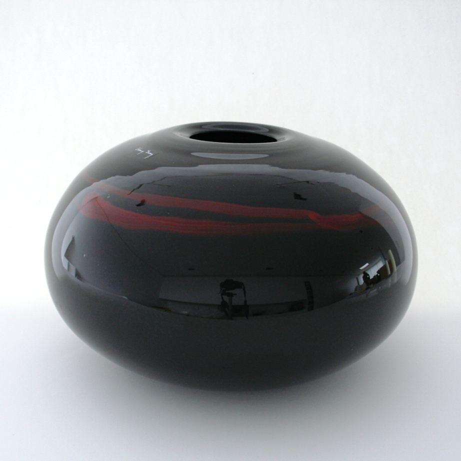 Vase sphérique noir avec des stries rouges, en verre soufflé, de la collection et du verrier Henry Dean.